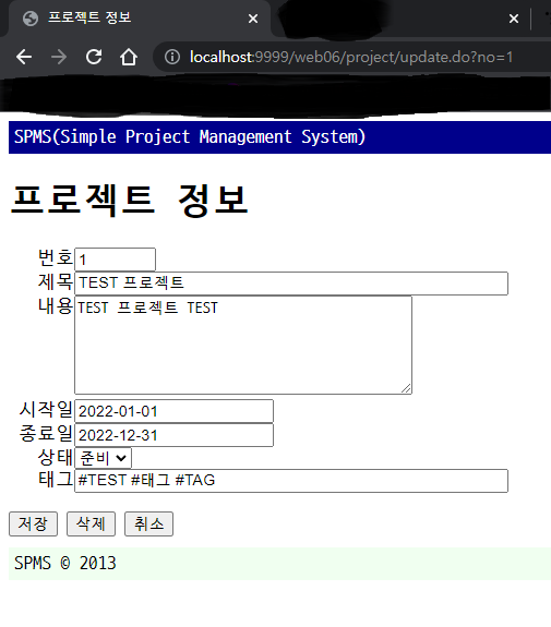 프로젝트 목록에서 프로젝트 제목을 클릭하면 상세 정보를 출력해야 한다. 프로젝트의 상세 정보를 출력할 JSP(webapp/project/ProjectUpdateForm.jsp)를 생성한다. 이때 상세 정보 페이지에서 데이터를 바로 변경할 수 있도록, 프로젝트 입력폼처럼 <form> 태그를 사용한다(그림 1).