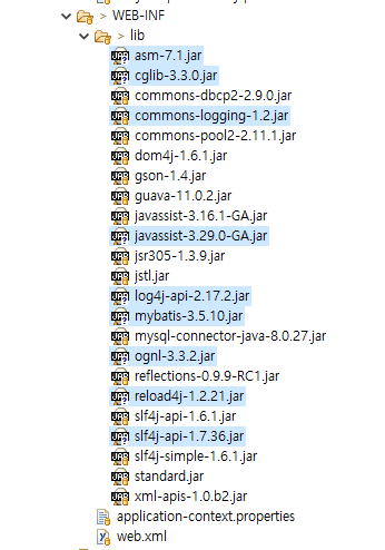 mybatis-3.5.10.jar 파일과 의존 라이브러리들을 web07/webapp/WEB-INF/lib 폴더에 복사한다. 단, 중복 파일이 있으면 버전이 낮은 파일을 삭제한다(그림 7).