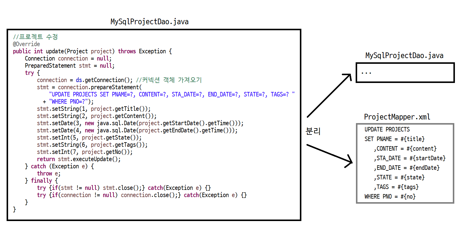 앞의 그림과 같이 기존의 MySqlProjectDao 클래스는 자바 코드와 SQL문이 섞여 있어 코드를 읽기가 어렵다. 또한, SQL문을 만들고자 문자열과 더하기(+) 연산자가 얽혀 있어 소스 코드가 매우 지저분하다. SQL문은 FROM절이나 WHERE절 앞에 공백이 있어야 하는데 문자열들을 붙이다 보면 생략하는 경우가 있어 이런 경우 SQL 구문 오류가 발생한다.