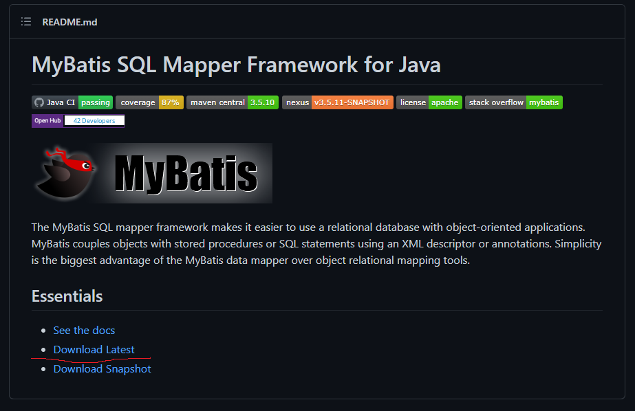 'mybatis-3' 프로젝트 홈의 아래로 내려가면, 'README.md'가 보인다. 여기에서 JAR 파일을 내려받기하는 링크를 클릭한다(그림 4).
