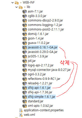 예를 들어 앞의 그림에서는 세 개의 라이브러리가 중복되는데, 그 중에서 버전이 낮은 파일(javassist-3.16.1-GA.jar, slf4j-api-1.6.1.jar, slf4j-simple-1.6.1.jar)을 삭제하면 된다(그림 8).