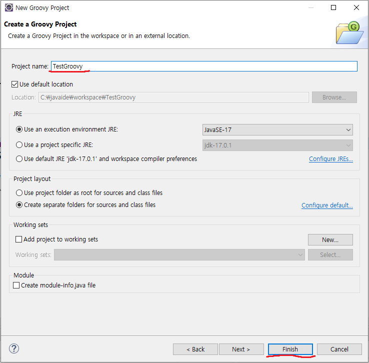 2) 프로젝트 생성 창에서 프로젝트 이름을 'TestGroovy'라고 입력한다. 그리고 <Finish> 버튼을 클릭하여 프로젝트를 생성한다(그림 3).