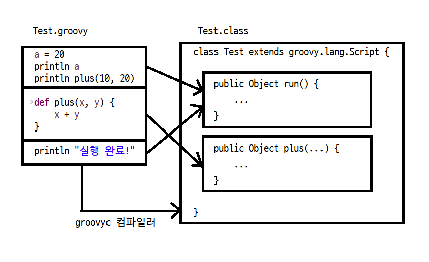 그루비 소스를 컴파일하면 앞의 그림과 같이 소스 파일 이름과 동일한 이름으로 자바 클래스 파일이 생성된다. 그루비 소스의 plus() 메서드는 Test 클래스의 메서드로 변환된다. 그 외 메서드 밖에 작성한 모든 코드는 순서에 상관없이 Test 클래스로 변환될 때 run() 메서드 안에 들어간다. Test 클래스가 생성될 때 main() 메서드가 자동 생성되는데, 이 main() 메서드에서 run() 메서드를 호출하는 것이다. 이런 원리로 Test.groovy의 실행 결과가 앞에서처럼 출력된 것이다.