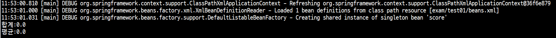 실행 결과를 확인해 보면 아무런 오류 없이 합계와 평균 값이 출력된다. 정상적으로 Score 객체를 찾아 sum() 메서드와 average() 메서드를 호출하였다. 단 score 객체에 대해 국어, 영어, 수학 점수를 할당하지 않아서 출력 결과가 0.0이 되었다(그림 4).