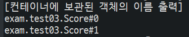 getBean() 메서드를 호출하여 익명 빈을 꺼낼 때는 빈의 이름으로 "패키지명 + 클래스명#인덱스"를 사용한다. 반환된 인스턴스를 비교해 보면 당연히 'exam.test03.Score'는 'exam.test03.Score#0'의 별명이기 때문에 같은 객체라는 것을 확인할 수 있다.