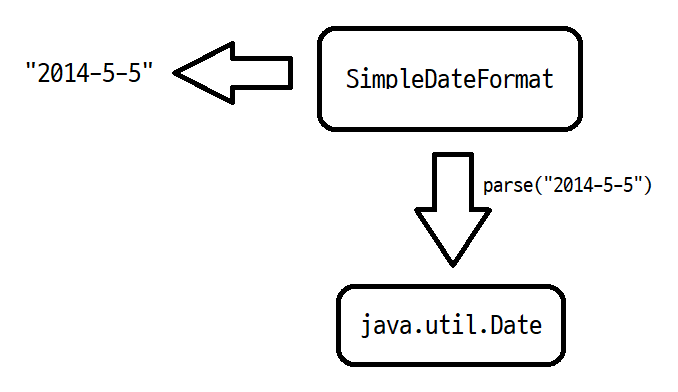 SimpleDateFormat 객체는 날짜 형식의 문자열을 java.util.Date 객체로 변환해 준다. 생성자 매개변수 값으로 날짜 형식을 지정한다. yyyy는 4자리로 이루어진 년도(예 : 2014)이다. MM은 월(예 : 05 또는 5)이다. dd는 해당 월의 일자(예 : 05 또는 5)이다. 즉 2014-5-5 형식의 문자열을 java.util.Date 객체로 만들어 준다.