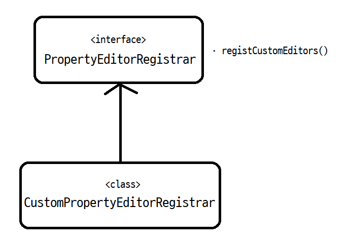 PropertyEditorRegistrar 인터페이스에는 한 개의 메서드가 선언되어 있다. 빈 컨테이너가 프로퍼티 에디터를 설치할 때 호출하는 메서드(registCustomEditors())이다. 에디터 등록기 클래스는 바로 이 메서드를 구현해야 한다.