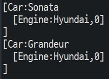 출력 결과를 보면 'car1', 'car2' 모두 정상적으로 엔진 객체가 할당된 것을 알 수 있다.