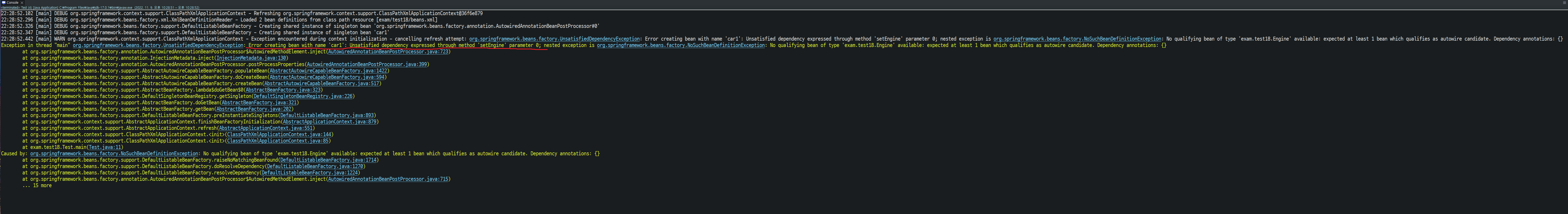 @Autowired로 선언한 engine 프로퍼티에 값을 주입하지 못할 때 예외가 발생하는 상황을 확인해 본다. exam.test18.Test 클래스를 다음과 같이 편집한다.