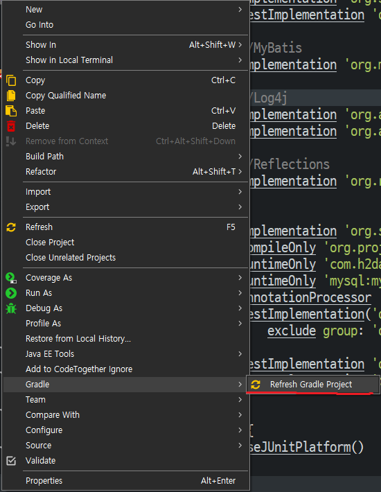 이제 Gradle 설정에 따라 빌드를 수행해 본다. 프로젝트 컨텍스트 메뉴에서 'Gradle'을 선택한 뒤 하위 메뉴에서 'Refresh Gradle Project'를 클릭하여 Gradle 빌드를 실행한다(그림 3, 그림 4).
