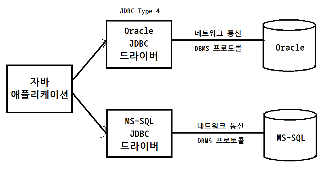 가장 많이 사용되는 방식이다. JDBC Type 4 드라이버는 DBMS 전용 프로토콜을 사용하여 DBMS와 직접 통신하므로 DBMS에 접속하는 PC에 DBMS 클라이언트 프로그램을 설치할 필요가 없다.