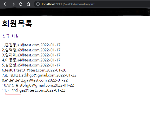 톰캣 서버를 재시작한 뒤 회원 정보를 다시 등록하고 회원 목록 조회 결과를 확인한다.