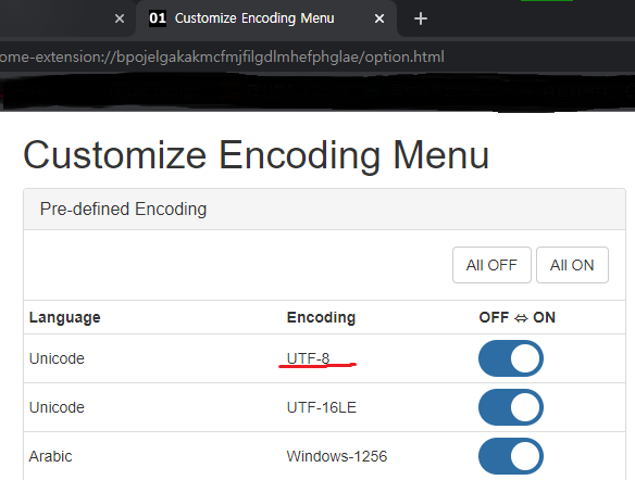(크롬은 따로 기본 문자집합을 확인할 수 있는 방법이 없어서 Set Character Encoding 이라는 크롬 확장 프로그램을 설치하여 확인하였다)