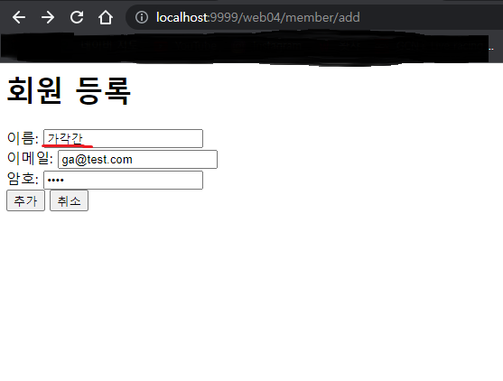 회원등록 입력폼의 이름 입력단에 한글 이름을 입력 후 추가버튼을 클릭한다(그림 1).