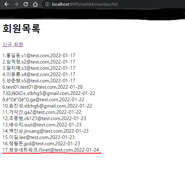 회원 정보 등록 후 결과 화면 없이 곧 바로 회원 목록 화면으로 이동한다. 등록한 회원정보가 마지막 행에 출력된 것을 볼 수 있다(그림 2).