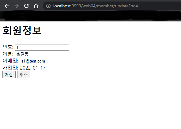회원 상세 정보를 가져오는 쿼리와 요청폼을 만든다. <form>태그의 action속성의 값은 회원 상세 페이지와 동일한 URL인 'update'이다. 즉 입력폼에서 '저장' 버튼을 누르면 현재 페이지와 동일한 /member/update로 요청한다. 다만, method속성이 'post'이기 때문에 서버에 POST 요청을 보낸다.
