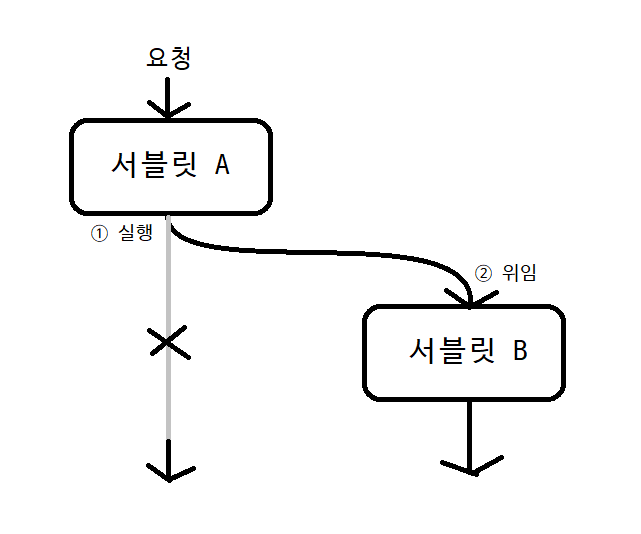 ② '서블릿A'에서 '서블릿B'로 실행을 위임한다.