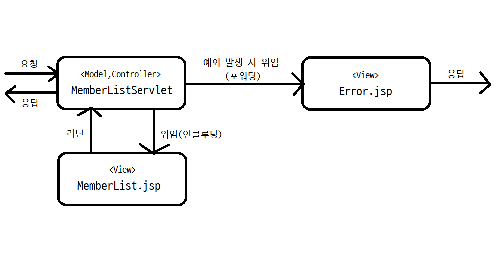 ② MemberListServlet 클래스는 데이터베이스에서 회원 정보를 가져온다. 그리고 출력을 위해 MemberList.jsp로 실행을 위임(인클루딩 방식)한다.