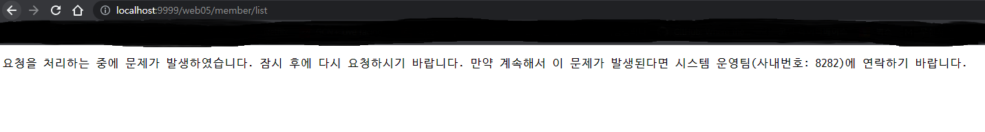 MemberListServlet 클래스에서 오류 처리 부분을 아래와 같이 바꾼다.