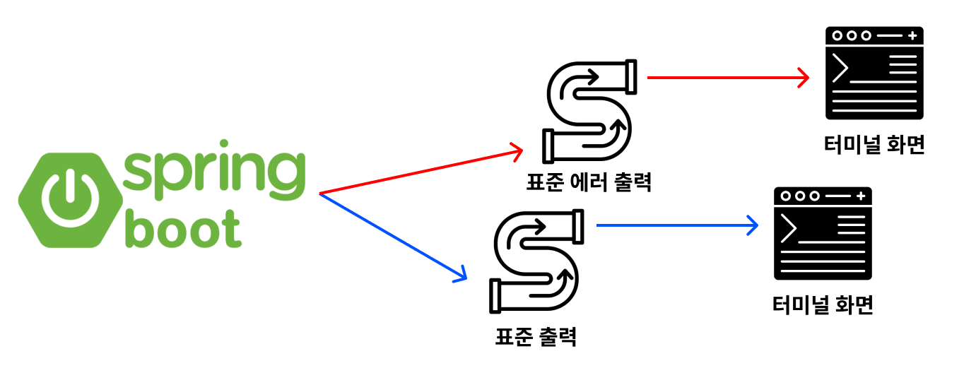 Spring Boot 출력되는 로그가 표준 출력, 표준 에러 출력으로 전달되면 터미널에 기본값으로 출력하게끔 세팅되어 있기 때문에 터미널에 로그가 나오는 것을 확인할 수 있다.