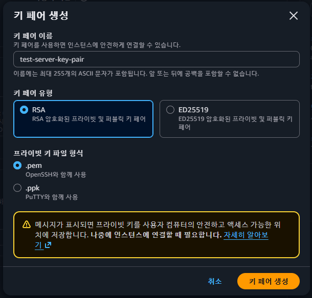· RSA, .pem 그대로 선택하여 키 페어를 생성한다. (ED25519, .ppk는 몰라도 되는데, 중요하지 않다)