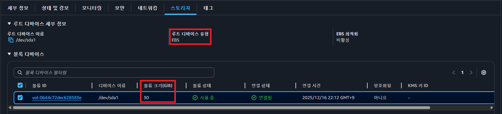 인스턴스 생성시 설정한 스토리지에 대한 정보가 나온다.