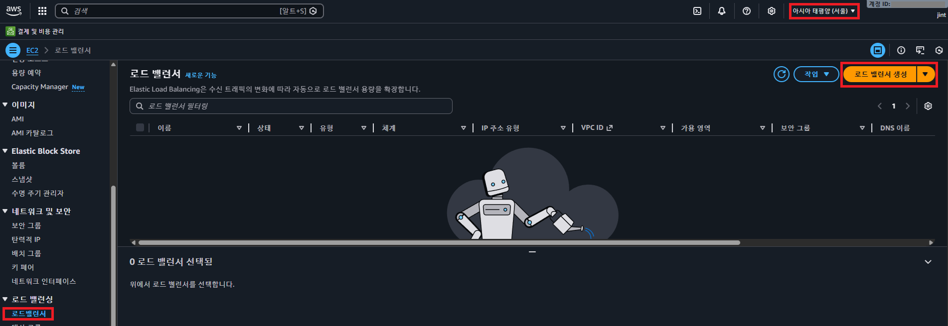 AWS EC2 서비스의 로드 밸런싱 > 로드밸런서 메뉴로 들어간다. 리전(Region)이 "아시아 태평양 (서울)" 것을 확인하고 "로드 밸런서 생성" 버튼을 클릭한다.