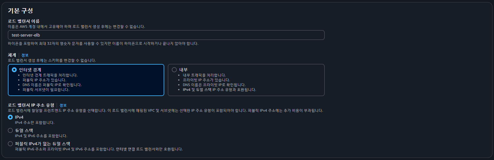 · 로드 밸런서 IP 주소 유형 : IPv4