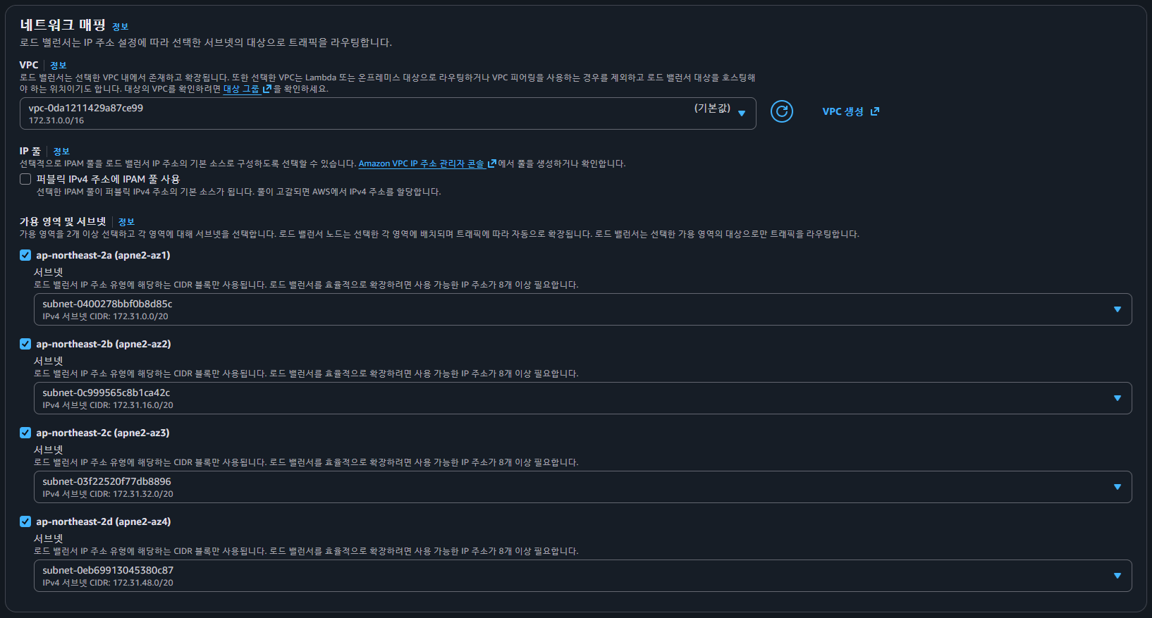 네트워크 매핑은 로드 밸런서가 어떤 가용 영역으로만 트래픽을 보낼 것인지 제한하는 기능이다. 가용 영역이란, 간단히 리전 내부에 세부적인 지역/영역을 나눠놓은 개념이다. 가용 영역에 제한없이 모든 영역에 트래픽을 보내도록 설정한다. 즉, 모든 가용 영역에 다 체크한다.