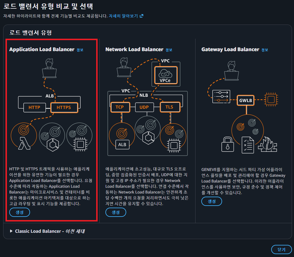 Application Load Balancer를 선택한 이유를 간단히 설명하면, HTTP, HTTPS에 대한 특징을 활용하기 위함이다.