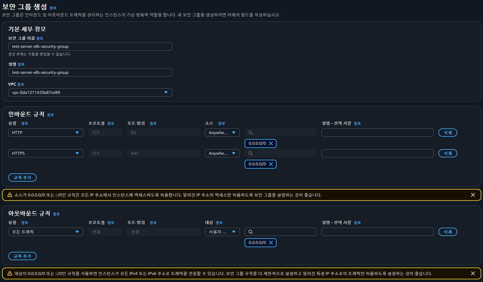 기본 세부 정보, 인바운드 규칙을 설정하고 "보안 그룹 생성" 버튼을 클릭한다.