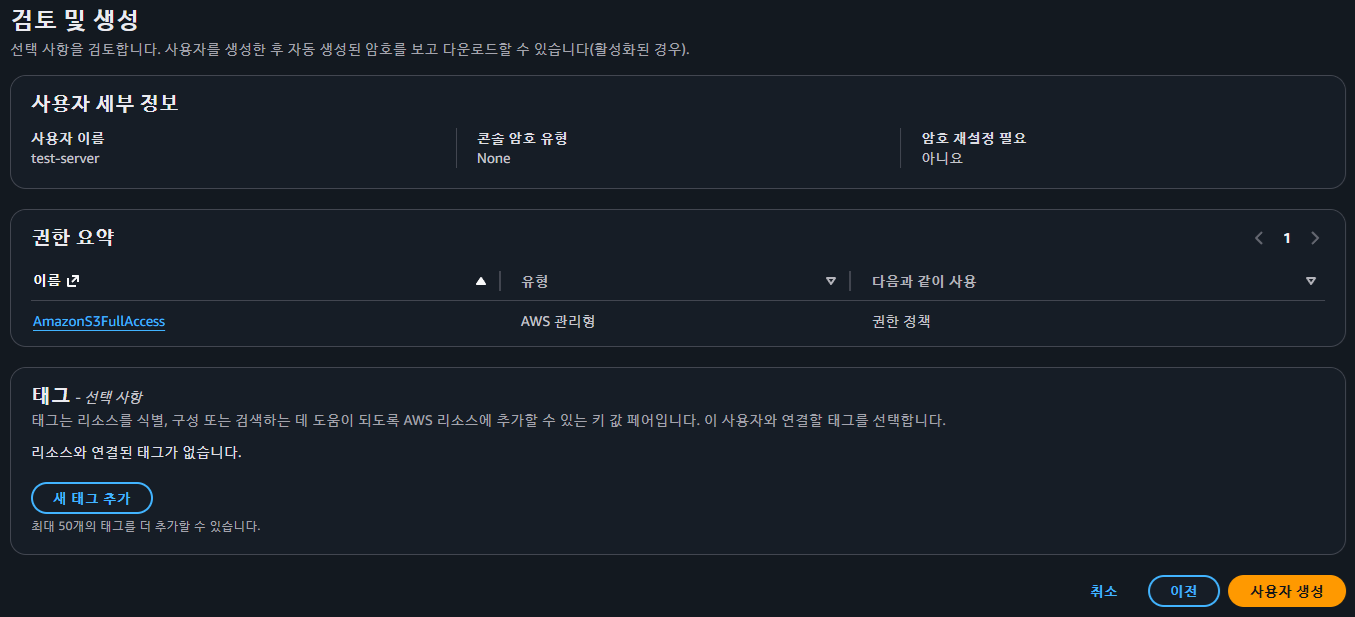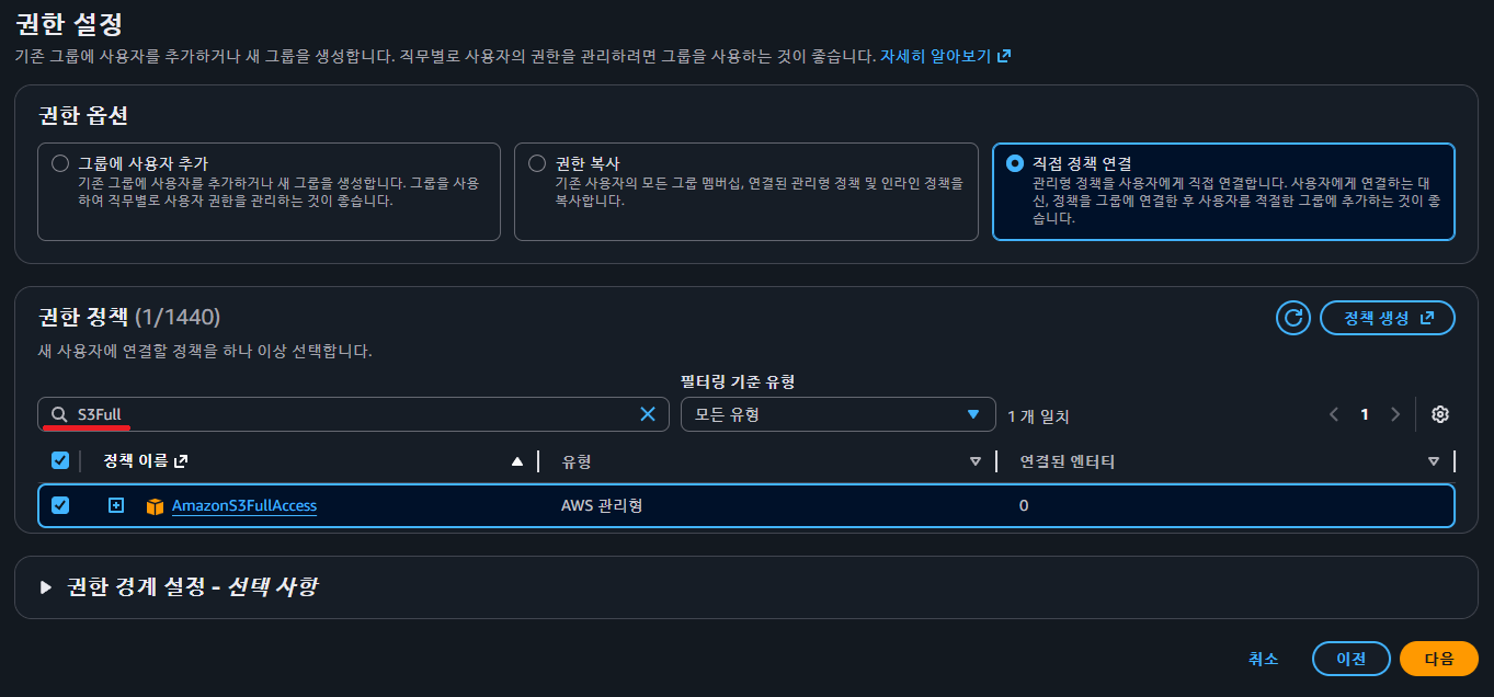 권한 정책에 "S3Full" 검색어를 입력하여 "AmazonS3FullAccess" 권한을 선택한다. S3에 접근할 수 있는 모든 기능에 대한 권한이다.