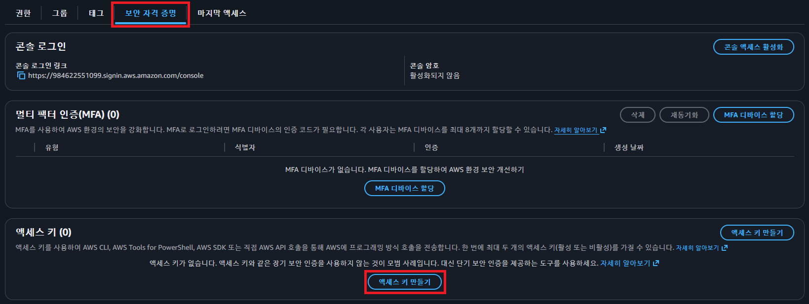 "보안 자격 증명" 탭에서 액세스 키 설정 부분에서 "액세스 키 만들기" 버튼 클릭