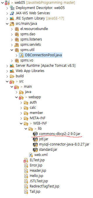 'commons-dbcp2-2.9.0-bin.zip' 파일의 압축을 푼 다음에 'commons-dbcp2-2.9.0.jar' 파일을 web05/src/main/webapp/WEB-INF/lib 폴더에 복사한다(그림 4).