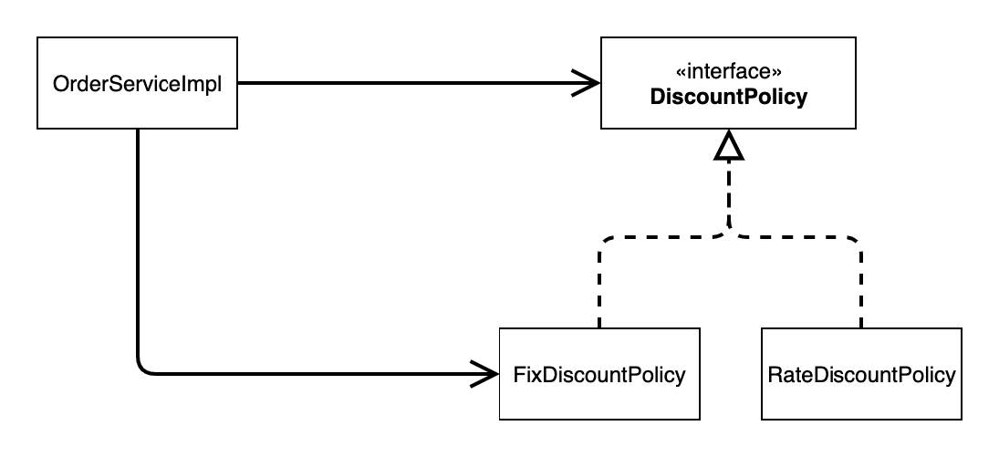 FixDiscountPolicy 를 RateDiscountPolicy 로 변경하는 순간 클라이언트인 OrderServiceImpl 소스 코드도 함께 변경해야 한다.